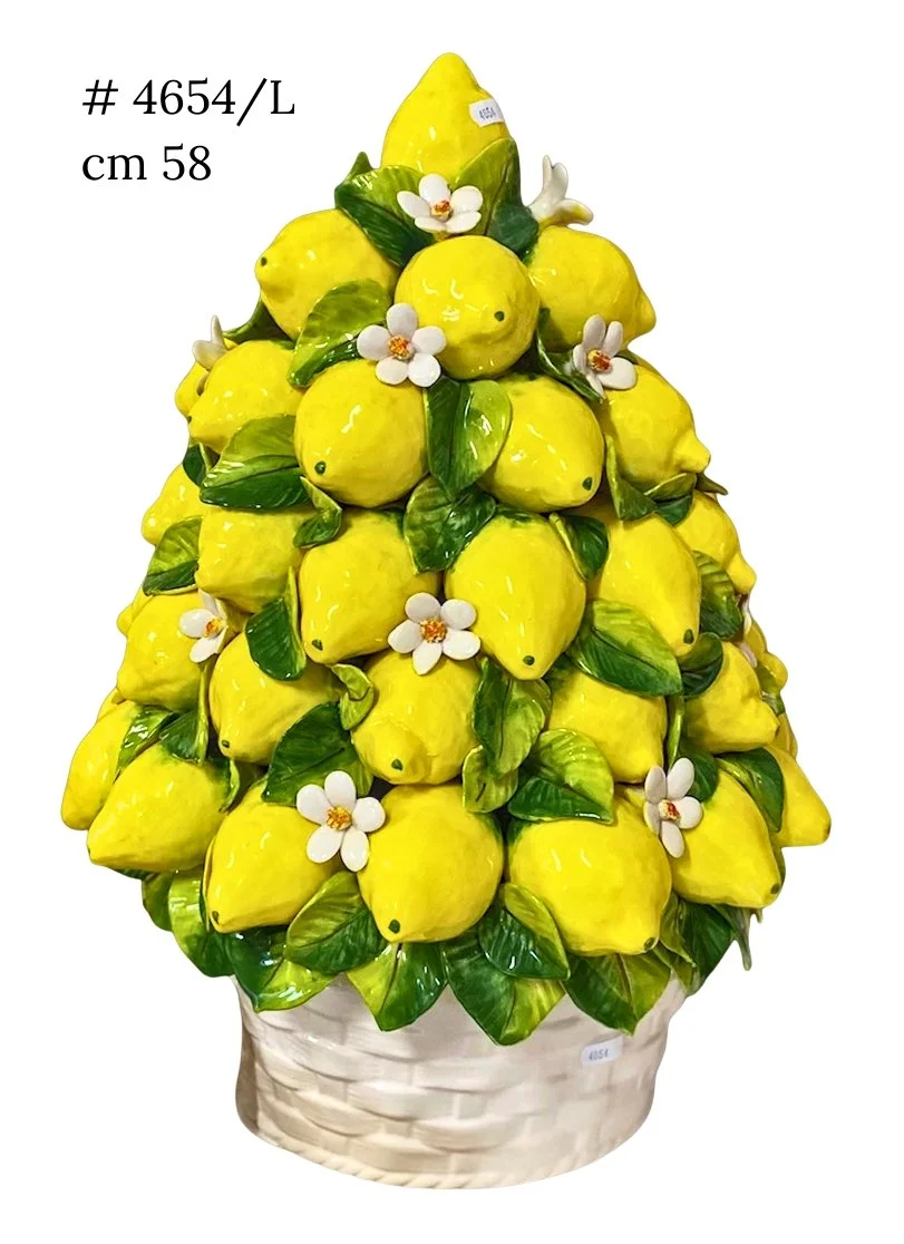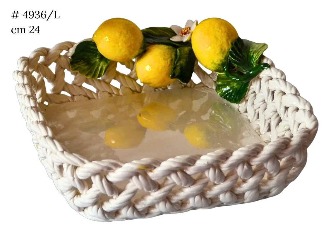 Cascate di limoni, cesti, portacandele, tavolini, biscottiere, anfore e molto altro. Ceramiche artigianali con limoni applicati e decorati a mano, ispirati ai colori della Costiera Amalfitana e del Salento.