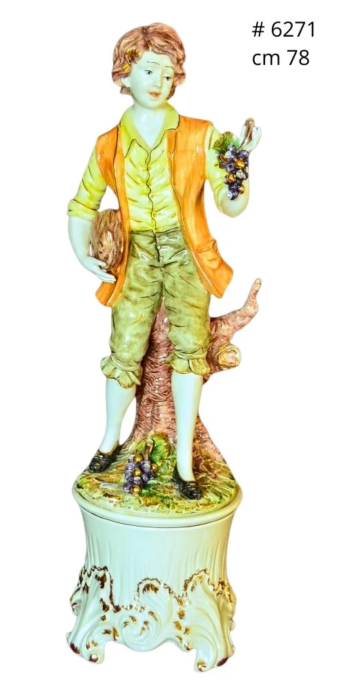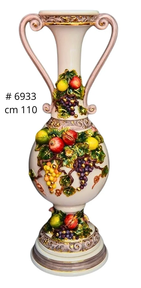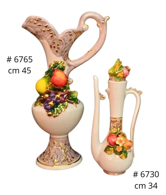 Ceramiczne dodatki do kuchni i domu z ręcznie nakładanymi owocami i winogronami, wykończone 24-karatowym złotem i ręcznie malowane. Dzbanki, oliwiarki, pudełka, koszyki i figurki ceramiczne.