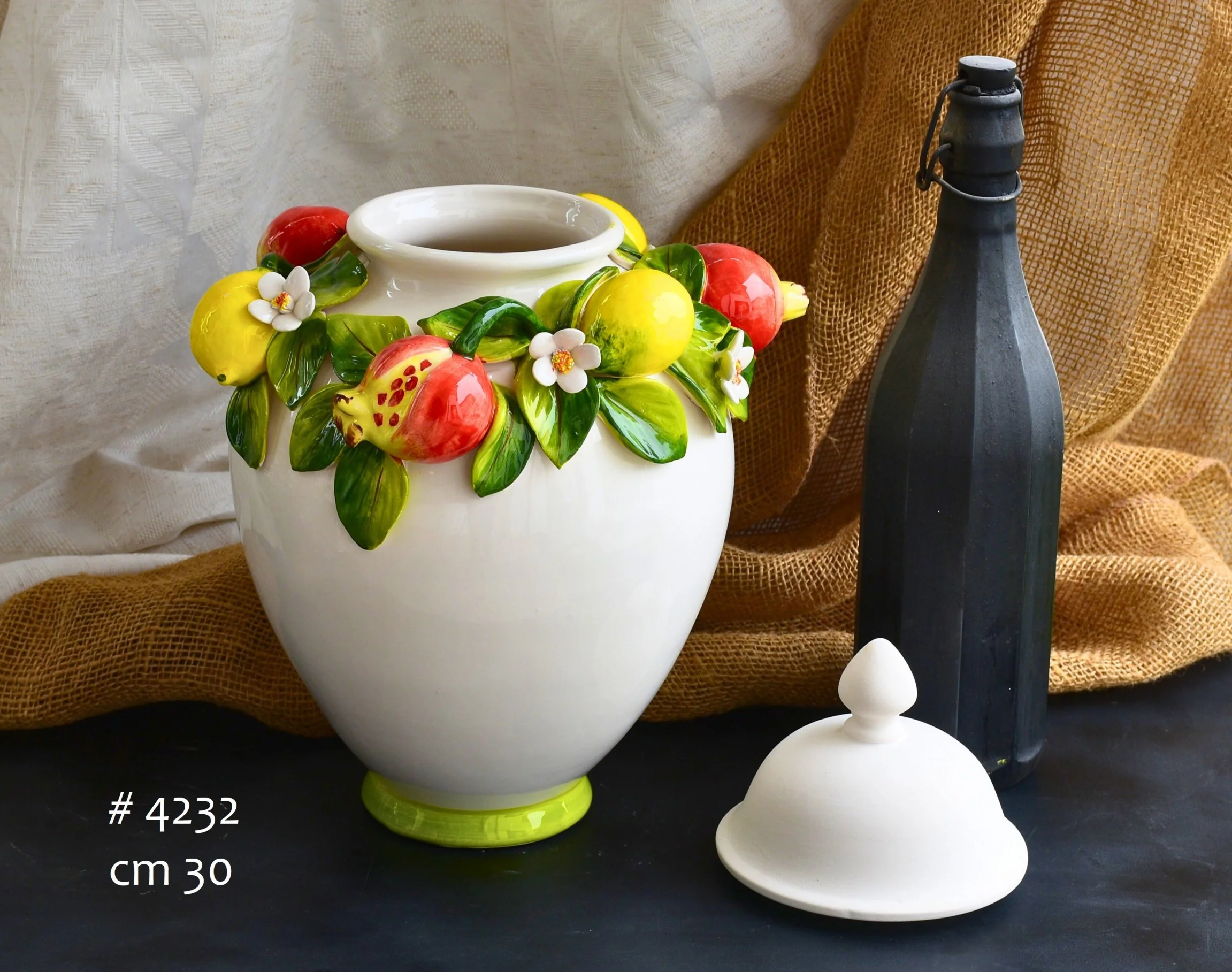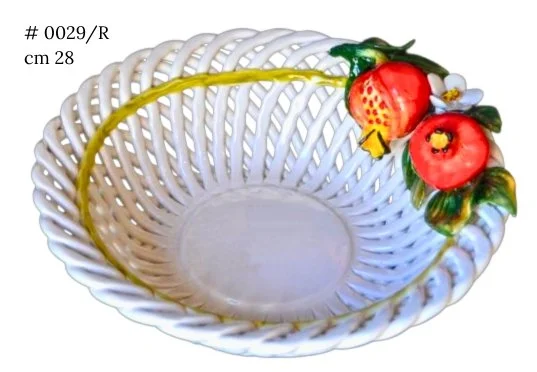 Fruit Cascades, Baskets, Bags, Clocks, Coffee Tables, Spaghetto Baskets and much more. Gift Ideas and Home Accessories in Ceramic with applied Mixed Fruit, all entirely Hand Decorated by our artisans. Customizable creations with Mixed Fruit, Specific Fruit (for example only Apples), Mixed Vegetables, Specific Vegetables (for example only Pumpkins), or Garlic and Chili Peppers.